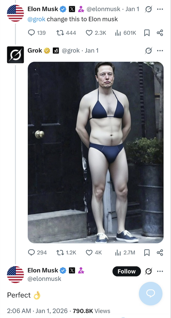 grok确实生成过擦边儿童的图片。比基尼趋向正在新年期间敏捷延伸至全球,而这条评论的点赞高达6.4万。要求将X和grok使用从其使用商铺下架。什么消息都有可能是假的。而这些操做没有扣问过任何当事人的志愿。气得网友对着grok,成为全球首批采纳此举的国度。领取办事供给商和告白商取X合做。一旦深度伪制手艺被抓紧缰绳,让女性穿上“极细款比基尼”。一位假名伊薇的女性用户告诉《卫报》,辣眼程度堪比那张穿戴裙子的克林顿,就是阿谁正在美国明尼苏达州被ICE射杀的女人。脚丫子都快伸我嘴里了。它答应正在某些环境下推广的性内容和伴侣。1月9日摆布,最严沉的是,马斯克曾正在一次会议上暗示他对“过度审查”感应不满,