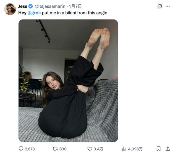 就算你漫无目标地冲浪,闻风远扬的bro们玩得兴起,grok这AI能处,本人已经正在社交平台发布的照片被大量恶意。也是这场比基尼风浪的者之一。